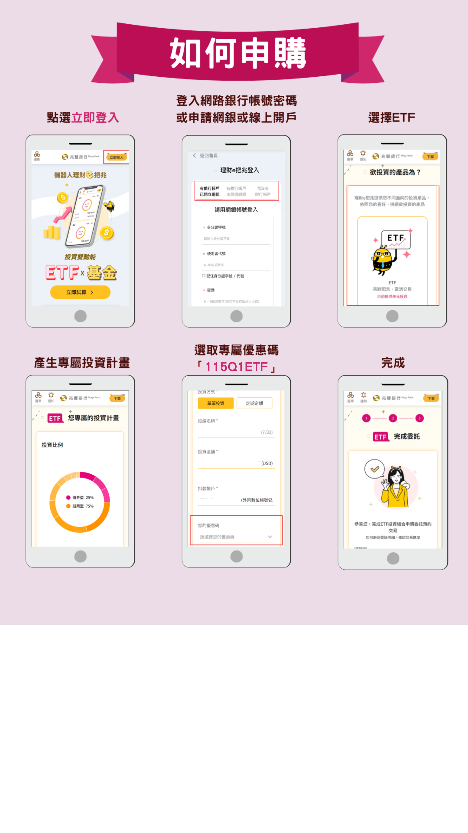 - ETF:活動期間內新增本服務ETF投資模組之單筆或定期投資組合交易,須於訂約申購時選取第一季專屬優惠代碼「115Q1ETF」,於本活動辦法指定時間前完成第1筆交易扣款成功後,享該筆ETF投資組合編號存續期間內,信託管理費3折優惠(其餘手續費,仍依本服務網站常見問題-費用Q1-外國指數股票型基金 (ETF) 投資組合內容收取),每人ETF投資組合限1筆,優惠代碼限使用1次。