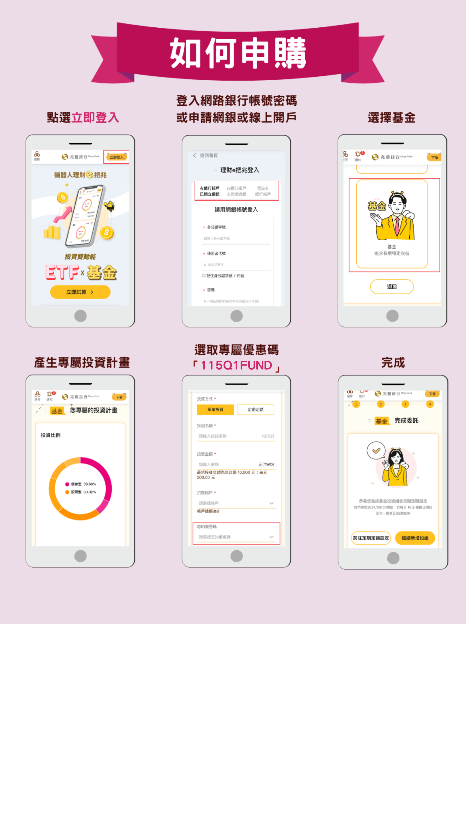 - 基金:活動期間內新增本服務基金投資模組之單筆或定期投資組合交易,須於訂約申購時選取第一季專屬優惠代碼「115Q1FUND」,於本活動辦法指定時間前完成第1筆交易扣款成功後,即可享該筆基金投資組合編號存續期間內,信託管理費3折優惠,每人基金投資組合限1筆,優惠代碼限使用1次。