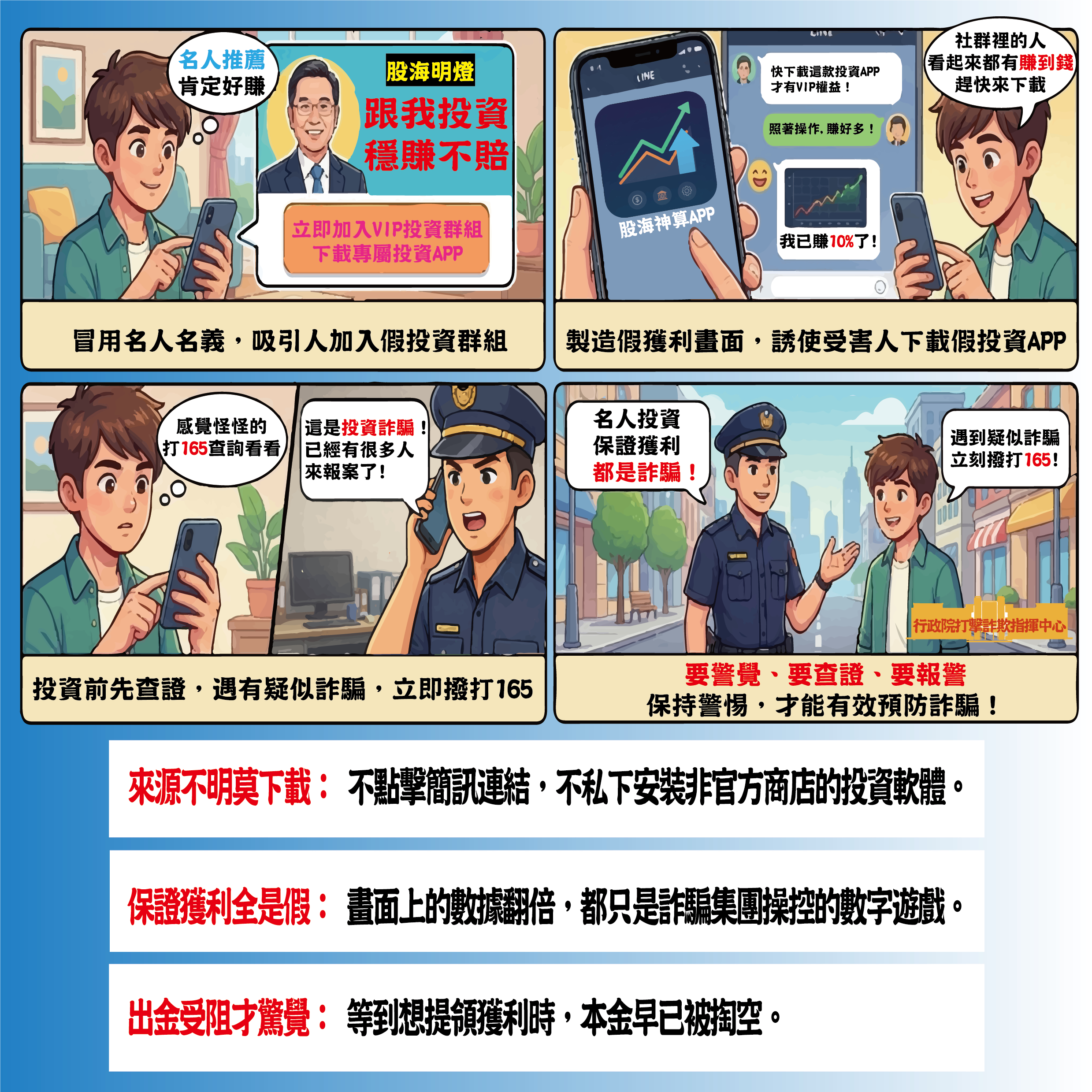 | 假名人投資詐欺手法 | 假投資詐騙流程 | 文宣1 |