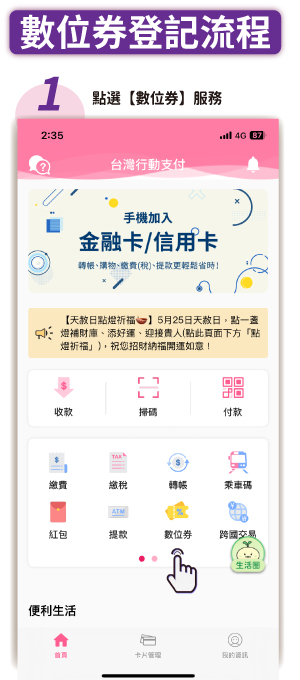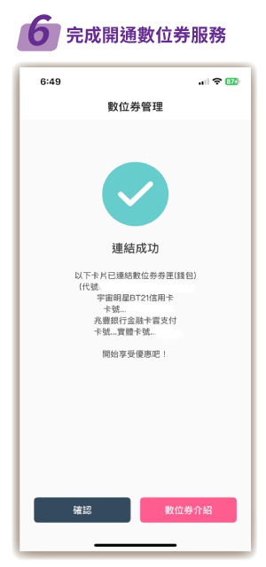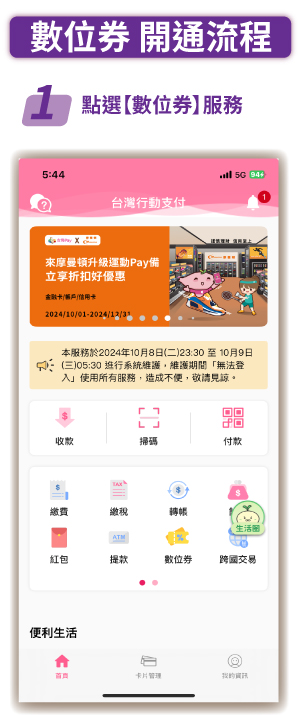 - 操作便捷:無須下載額外APP,使用台灣行動支付APP,即可開通「數位券」服務,進行消費折抵。