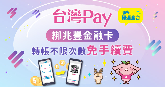 優惠1:使用「兆豐行動銀行APP」兆豐行動支付(台灣Pay)綁定兆豐金融卡並以QR Code掃碼方式進行轉帳,享不限次數免手續費。優惠2:使用「台灣行動支付」APP綁定兆豐金融卡進行轉帳,享不限次數免手續費。