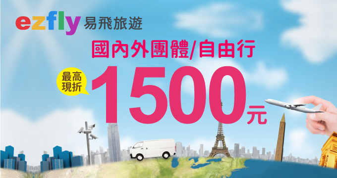 於ezfly易飛旅遊官網訂購國外團體、國內外自由行,輸入優惠代碼【MEGAFLY】並以兆豐卡付款,享最高現折NT$1,500優惠。