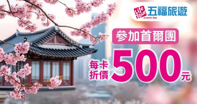 於五福旅遊官網訂購【首爾團體行程】商品並以兆豐卡付款,享每卡折價NT$500優惠。