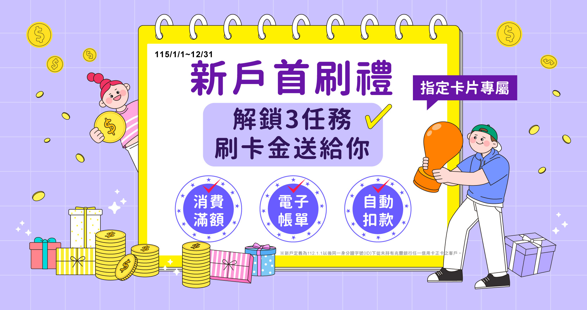 - 「新戶」定義為112.1.1以後同一身分證字號(ID)下從未持有兆豐銀行任一信用卡正卡之客戶,且核卡日需於115.1.1~115.12.31 (含)成功核發指定卡別正卡,核卡日以本行系統所載為準。