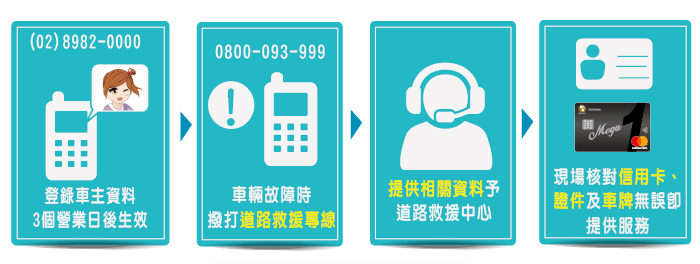 - 下載「兆豐銀行」APP→「選單」→「信用卡」→「卡友服務」→「道路救援申請/異動」進行登錄。
