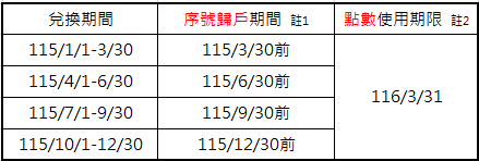 註2:序號歸戶後,點數可使用之期限